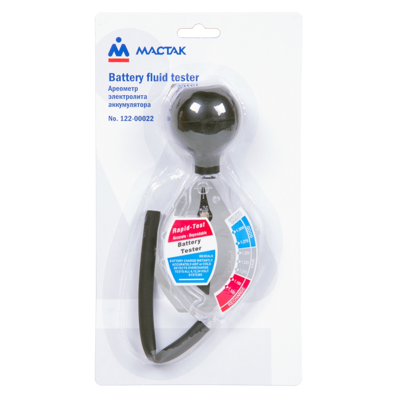 Ареометр торговой марки Мастак используется в автосервисах и на станциях техобслуживания. Позволяет проверить плотность электролита в аккумуляторах с напряжением 6, 12 и 24 В. Устройство характеризуется надежностью и высокой точностью измерений.