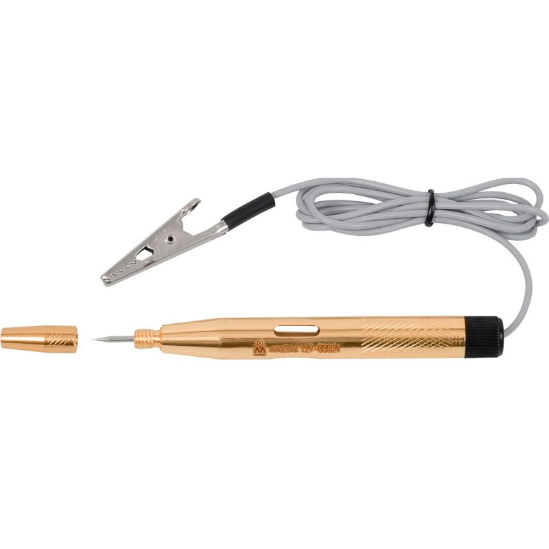 Индикатор напряжения Мастак применяется в автосервисах и мастерских при проведении диагностики или ремонта электросистем автомобиля. Проверяет обесточенность цепи. Оснащен встроенной стальной иглой и клеммой заземления. Корпус выполнен из латуни.