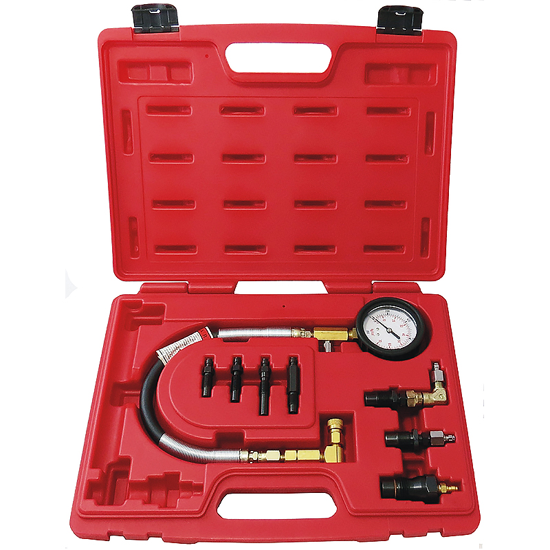 Компрессометр известного бренда Мастак используется в автосервисах и на станциях техобслуживания для диагностики компрессии дизельных двигателей многих марок автомобилей. В комплект входят манометр, различные адаптеры, армированный гибкий шланг, клапан фиксации, и пластиковый кейс для хранения инструментов. Устройство характеризуется высокой точностью и простотой в эксплуатации.