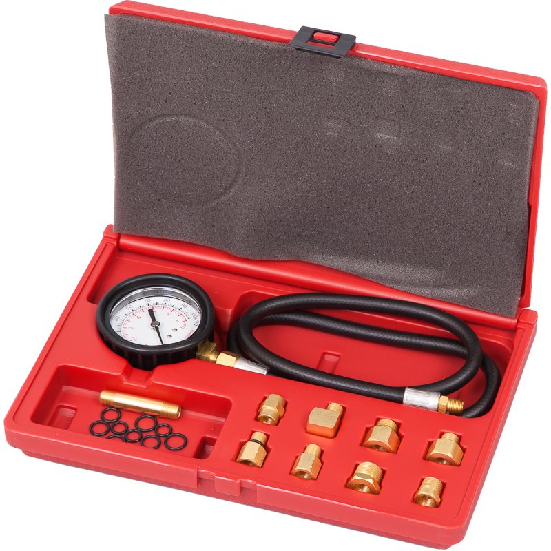 Манометр Мастак поставляется в комплекте с различными адаптерами, резиновыми прокладками и гибким шлангом. Ударопрочный кейс существенно облегчает хранение инструментов. Данное приспособление используется для диагностики работы масляного насоса в дизельных и бензиновых двигателях. Устройство подходит для грузовых и легковых автомобилей, а также тракторов.