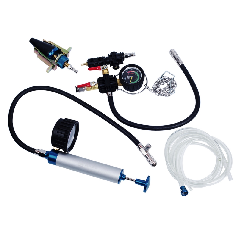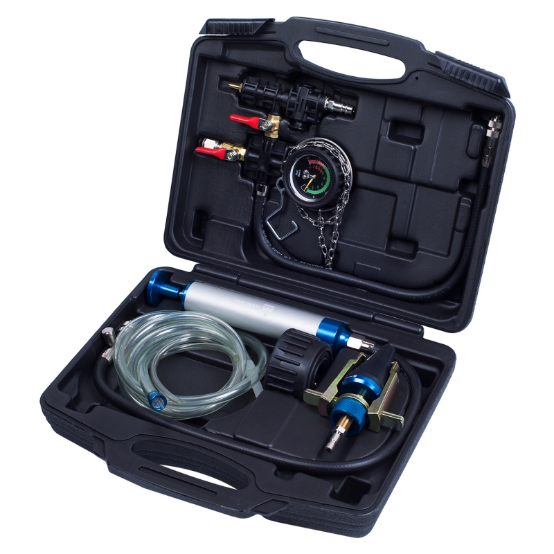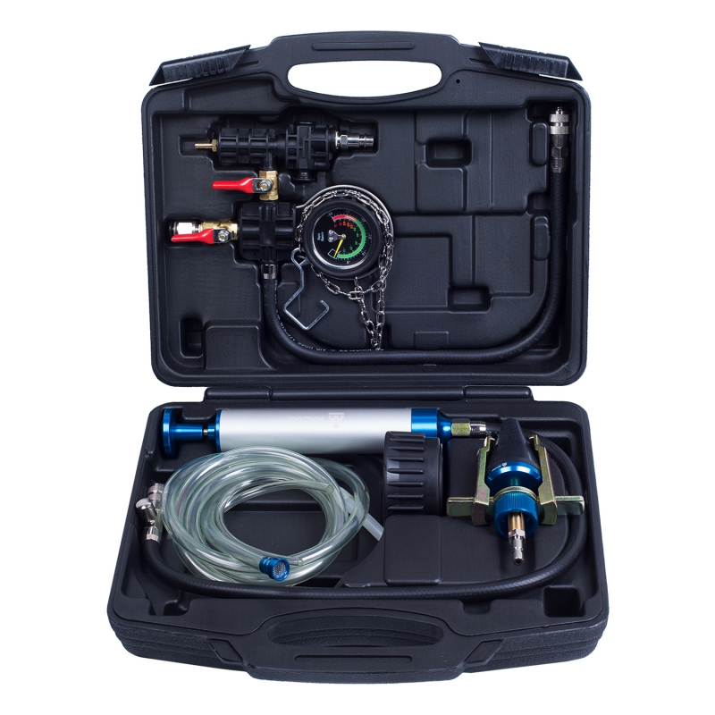 Набор торговой марки Мастак состоит из универсальной конической насадки, ручного насоса и вакуумного устройства с манометрами. Широко применяется в автосервисах для работы с системой охлаждения автомобилей азиатского и европейского производства. Данное приспособление позволяет не только определить место утечки хладагента, но и произвести его замену. Поставляется в удобном пластиковом кейсе.