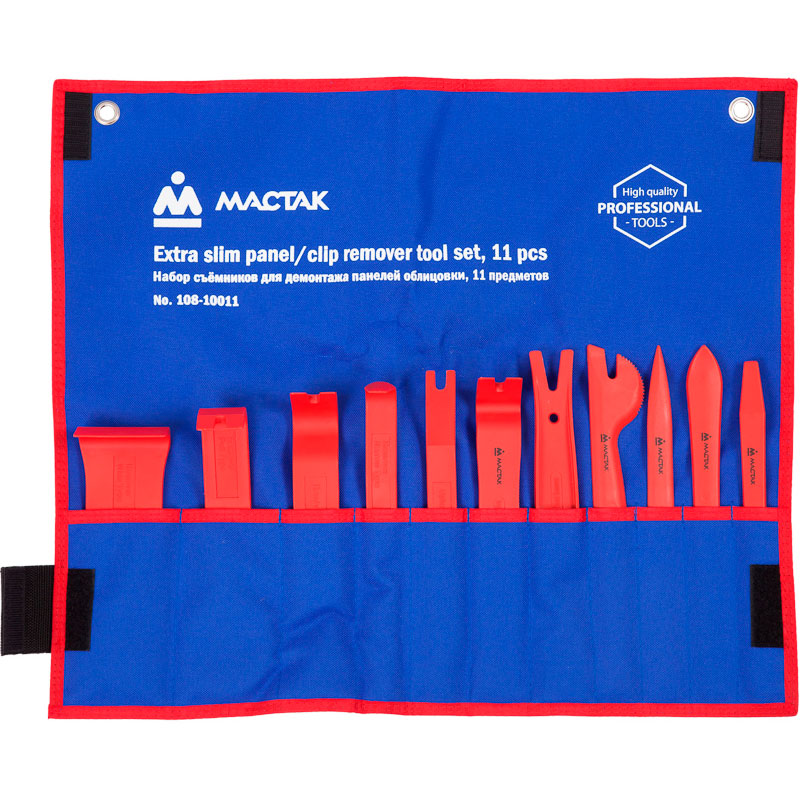 Набор съемников торговой марки Мастак используется в автосервисах и мастерских для демонтажа клипс, фитингов, замков и прочих пластиковых элементов обшивка салона автомобиля. Изделия имеют разную форму размеры. Выполнены из прочного нейлона. Тетороновый чехол для хранения в комплекте.