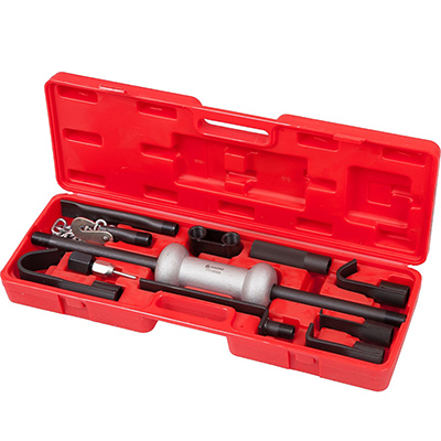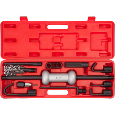 Обратный рихтовочный молоток в комплекте с принадлежностями включает в себя 9 элементов в специальном кейсе. Применяется в сфере профессионального автосервиса для устранения механических повреждений, правки вмятин, реставрации каркасов кузовов, восстановления других частей автомобиля, а так же для прочих слесарных, правочных и демонтажных работ.