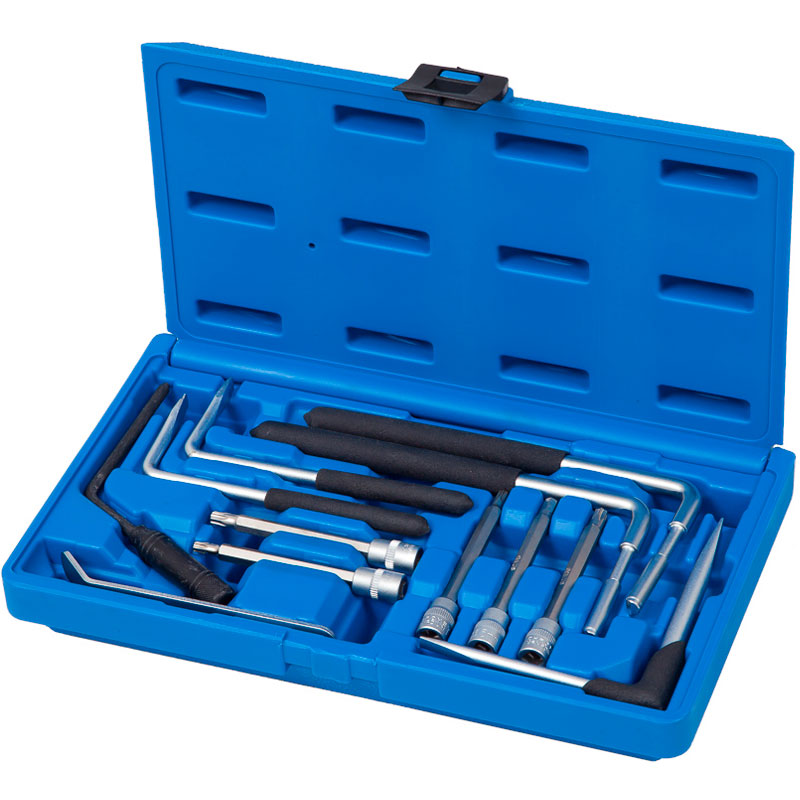 Набор торговой марки Мастак состоит из четырех запрессованных головок и специального инструмента. Используется при проведении работ по замене подушек безопасности. Изделия выполнены из прочного материала. Ручки имеют удобную форму. Кейс для хранения и транспортировки в комплекте.