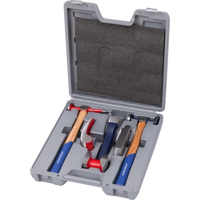 Рихтовочный комплект включает в себя 6 инструментов (молотки с двусторонними бойками круглой, квадратной и клиновидной формы, поддержки-наковальни различной конфигурации), предназначенных для рихтовки автомобильных кузовов (правка частей из листового металла, устранение механических повреждений, выпрямления вмятин). Эксплуатируется на объектах автосервиса, специализирующихся на восстановлении транспортных средств после аварий.