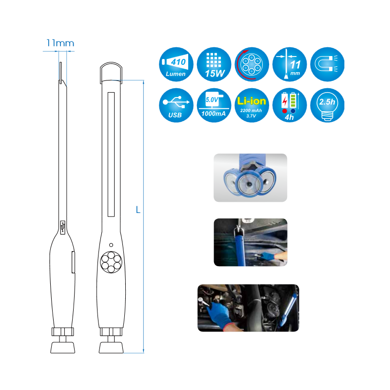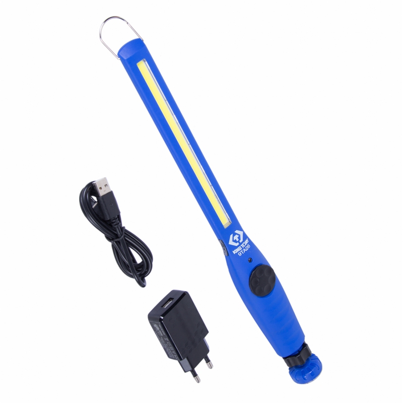 Удобный в использовании фонарь от King Tony яркостью в 410 люмен незаменим в арсенале любого автомастера. Тонкий корпус с шарнирным механизмом позволит работать в труднодоступных и плохо освещенных местах. Основание с мощным магнитом легко зафиксируется на металлической поверхности. Зарядить устройство можно от сети либо от автомобильного прикуривателя, такую возможность дает вилка с USB-переходником.