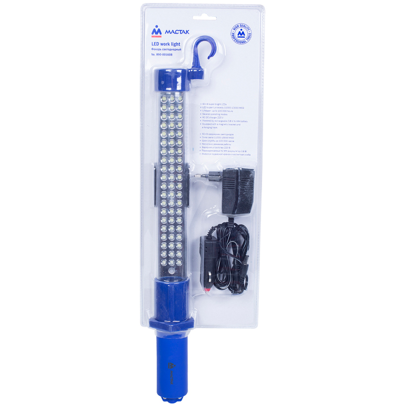 Практичный фонарь от известного производителя МАСТАК идеален для подсветки рабочих поверхностей во время ремонта. Модель функционирует от аккумулятора, входящего в комплект, потому нет необходимости нахождения возле розетки. 69 светодиодных элементов обеспечивают достаточное освещение труднодоступных мест в гараже, а также поможет в починке автомобиля в дороге. Подвес и магнит позволяют выбрать способ крепления.