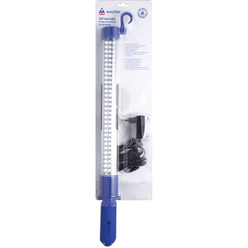 Удобный переносной фонарь от производителя МАСТАК подойдет для освещения во время стационарного ремонта в гараже или автосервисе, а так же при удалении от источника питания. Аккумулятор из набора обеспечит прибору запас энергии для автономной работы. Светодиоды в количестве 99 штук дадут достаточно света для работы с мелкими деталями. В качестве крепления лампы можно выбрать магниты или подвес.