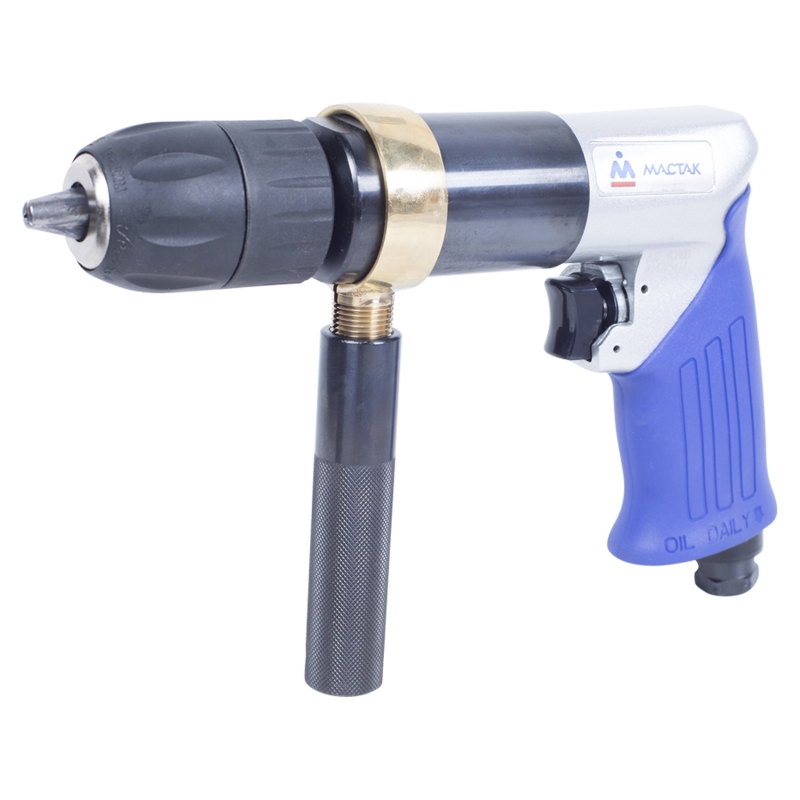 Пневматическая дрель торговой марки Мастак используется в промышленности и на производстве для сверления отверстий в различных материалах. Инструмент имеет прочный корпус, защищенный от влаги, пыли и механических повреждений. Данная модель оснащена функцией реверса и дополнительной рукояткой. Эргономичная форма способствует комфорту в работе. Быстрозажимной патрон облегчает замену оснастки.
