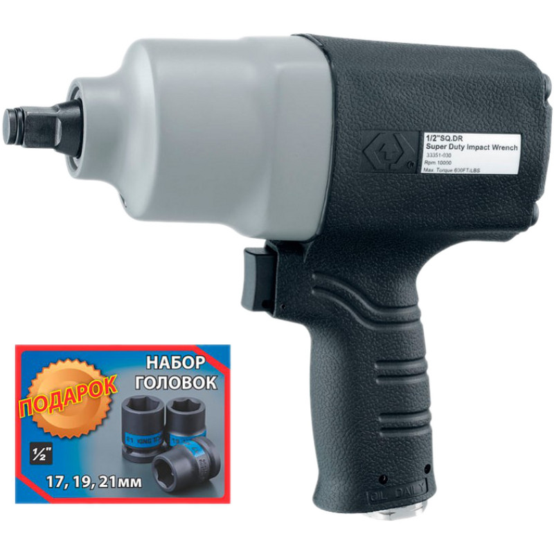 Гайковерт пневматический от популярной фирмы-производителя King Tony необходим мастеру при выполнении ремонтных работ высокой сложности. Корпус инструмента выполнен из легкого прочного сплава алюминия, что увеличивает срок службы. Рукоять из композитного материала не скользит в руке при работе. Регулятор момента затяжки позволяет работать в 2 режимах: простого завинчивания либо с ударом. Присоединительный квадрат 1/2″ дает возможность использования большого количества насадок. Подарочная комплектация с 3 дополнительными головками на 17, 19 и 21 мм делает инструмент незаменимым на производстве или при выполнении профессионального ремонта.