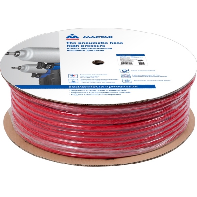 Пневматический шланг высокого давления МАСТАК длиной 100 м произведён из поливинилхлорида (гибкого пластика), применяется для подведения потоков сжатого воздуха от компрессора к рабочему месту и подключения пневматического инструмента (дрель, гайковёрт, шлифовальная машинка, распылитель). Предназначается для эксплуатации на объектах автосервиса (СТО, гаражи, мойки), в производственных помещениях, малярных цехах, в строительстве, а так же личных мастерских.