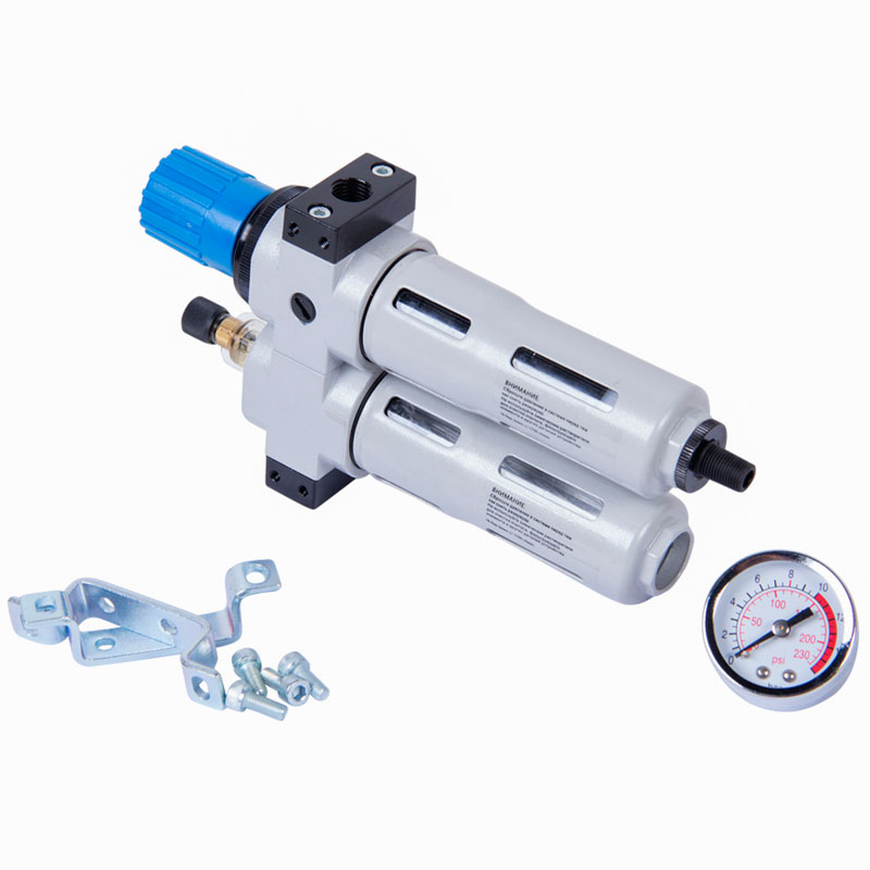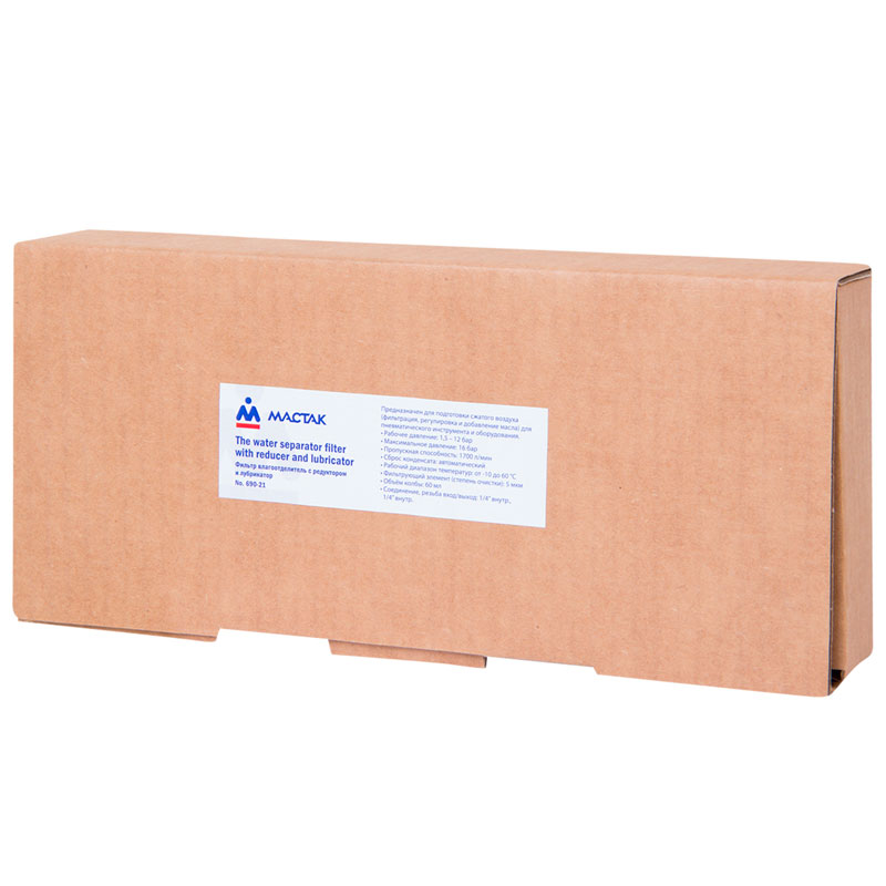 Фильтр влагоотделитель торговой марки Мастак предназначен для подготовки сжатого воздуха для пневмооборудования. Имеет возможность индивидуального монтажа. Основная область использования – станции техобслуживания и автосервисы. Конструкция включает в себя манометр, фильтр для сбора конденсата, редуктор для установки номинального давления на выходе и лубрикатор для подачи масла.