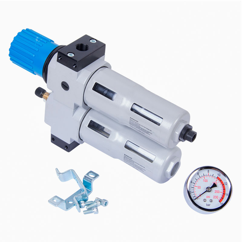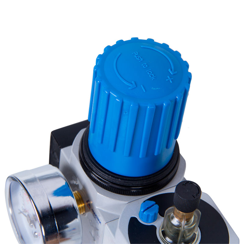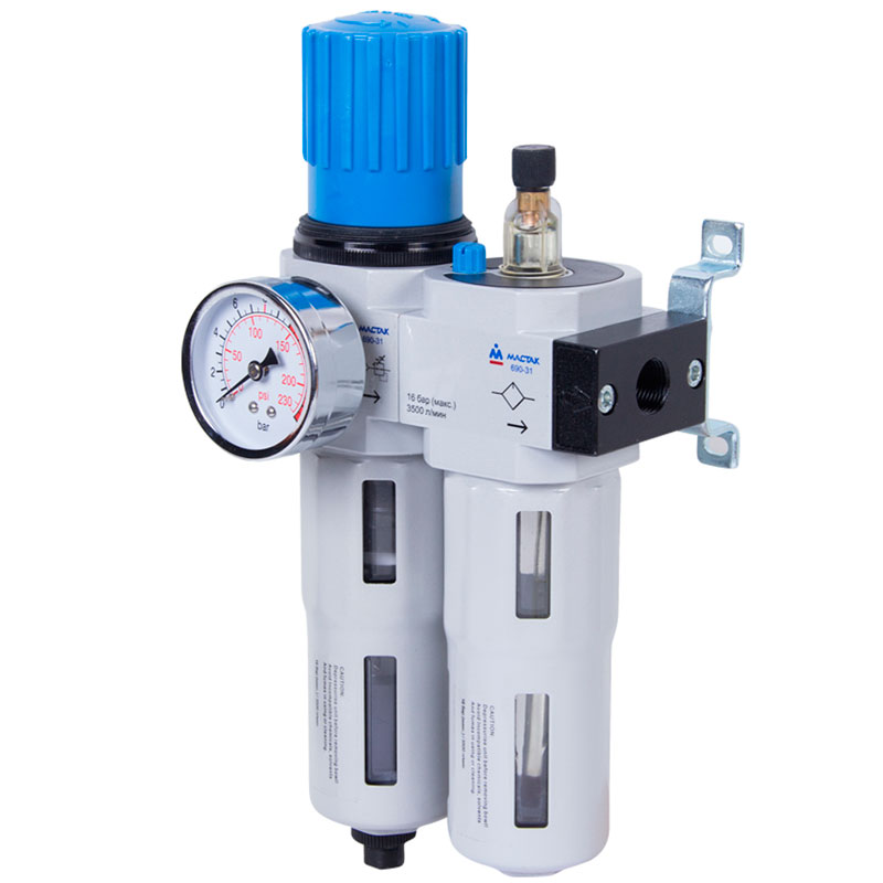 Фильтр влагоотделитель известного бренда Мастак применяется для очистки сжатого воздуха от масла, воды и твердых частиц. Используется совместно с пневматическими инструментами и оборудованием. Специальный вентиль позволяет регулировать давление, которое можно контролировать при помощи встроенного манометра. Лубрикатор преобразовывает масло в масляный туман. Устройство не заменимо на станциях ТО и в автосервисах.
