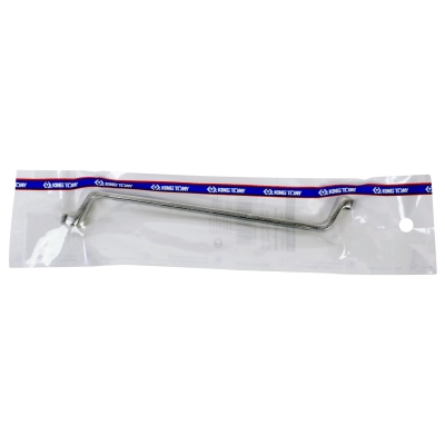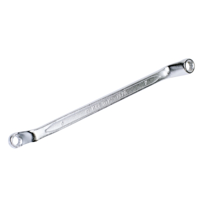 Накидной ключ с изогнутыми на 75 градусов захватами. Двенадцатигранная форма профиля. Инструмент изготовлен из сплава легированной стали и 15 примесей. Устойчив к воздействию внешней среды и повышенным нагрузкам.