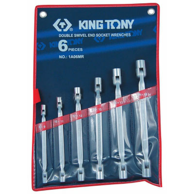 Набор шарнирных торцевых ключей King Tony состоит из 6 предметов (8 - 19 мм), комплект включает в себя несколько основных размеров, необходимых для работы с крепёжными элементами и резьбовыми соединениями. Область применения - обслуживание и текущий ремонт транспортных средств, спецтехники и других сложных механических устройств.