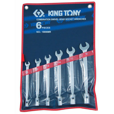 Набор комбинированных ключей с рожковым и подвижным шарнирным наконечником King Tony состоит из 6 предметов (10 - 19 мм), комплект включает в себя несколько основных размеров, необходимых для работы с крепёжными элементами и резьбовыми соединениями. Область применения - обслуживание и текущий ремонт транспортных средств, спецтехники и других сложных механических устройств.