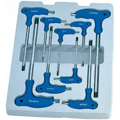 Набор торцевых ключей King Tony включает в себя 9 угловых инструментов (Т10 - Т50), предназначенных для затяжки и раскрутки резьбовых соединителей с профилем TORX. Данный комплект широко применяется в сфере автосервиса, с помощью торцевых ключей можно проводить ремонтные и механосборочные работы на СТО, в автомастерской или в гараже.