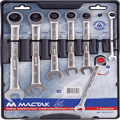 Набор комбинированных трещоточных ключей МАСТАК, 8-19 мм, 7 предметов