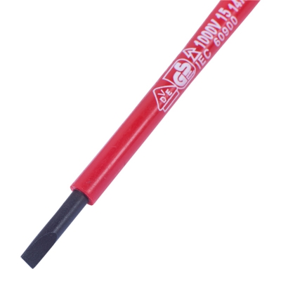 Плоская диэлектрическая отвертка. Наделена изоляционным покрытием, не проводящим электричество. Применяется в работе с резьбовыми креплениями, находящимися под напряжением до 100 вольт. Рукоять из двухкомпонентного материала не скользит в руке.