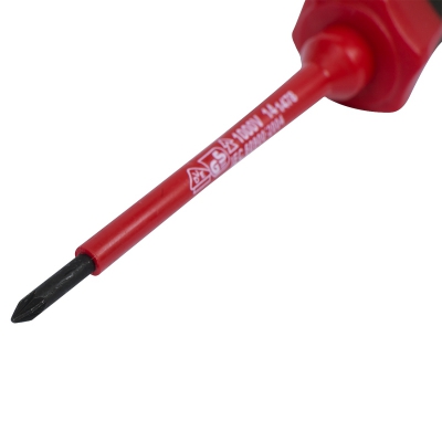 Крестообразная отвертка со шлицом PZ0. Наделена изоляционным покрытием. Предназначены для работы с резьбовыми винтовыми соединениями, находящимися под напряжением до 1000 вольт. Прочный стержень из стали выдержит повышенные нагрузки. Применяется в ремонтных мастерских или в производственных цехах.