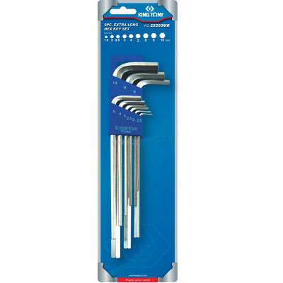 Набор Г-образных шестигранников King Tony состоит из 9 предметов (1,5 до 10 мм), которые применяются для затяжки или демонтажа крепежей с внутренним шестигранным профилем. С помощью данного набора можно выполнять множество слесарных и механосборочных работ в условиях цехового производства, а так же на СТО, в автомастерской или гараже.