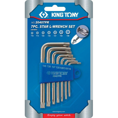 Комплект Г-образных шестигранников с профилем TORX в виде шестилучевой звезды King Tony состоит из 7 предметов (размер Т10 - Т40), которые применяются для закрутки и отсоединения крепёжных деталей (саморезов, болтов, шурупов) соответствующего профиля. Данные инструменты применяется для работы со сборно-разборными конструкциями, механическими устройствами и их составными частями.