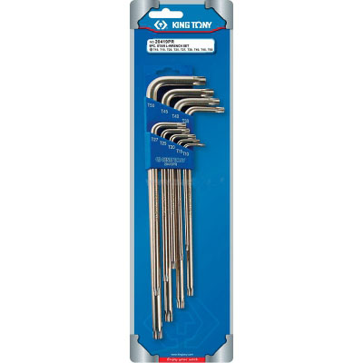 Комплект Г-образных шестигранников с профилем TORX в виде шестилучевой звезды King Tony состоит из 9 предметов (размер Т10 - Т50), необходимых для установки и демонтажа крепёжных соединений соответствующего профиля. Набор применяется для проведения работ в условиях производства, а так же в гаражах, автомастерских, сервисных центрах и СТО.