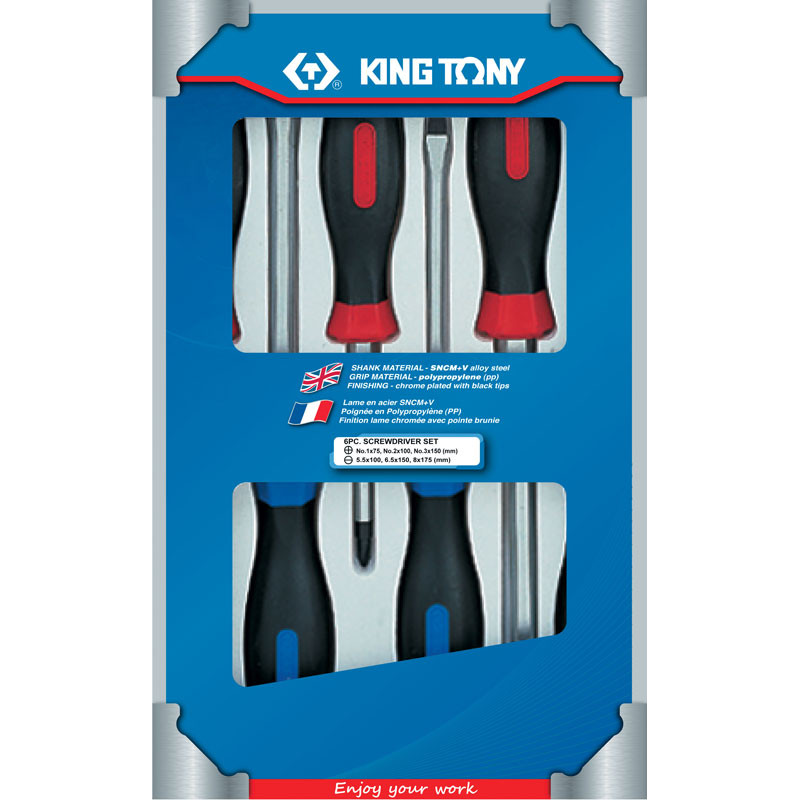 В наборе King Tony мастер найдет по 3 шлицевых и крестовых силовых отвертки. Инструменты имеют ручку из не скользящего в ладони двухкомпонентного материала, их удобно удерживать. Элементы набора упакованы в коробку, их будет приятно получить в подарок любому мужчине