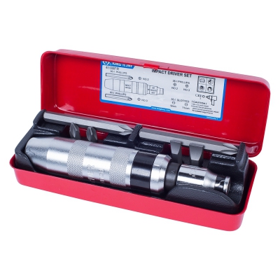 Ударная отвёртка King Tony оснащается вставками (битами) с помощью держателя, предназначена для раскрутки проблемных резьбовых соединений. При ударном воздействии на торцевую часть инструмента, насадка проворачивается на 1-2 мм, что вполне достаточно для срыва прикипевшей или ржавой крепёжной детали. Изделие наиболее востребовано при проведении работ по разбору и демонтажу различных механизмов и металлоконструкций.