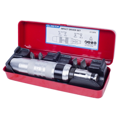 Отвёртка ударная King Tony с принадлежностями (6 предметов в наборе) применяется для работы с резьбовыми соединениями, которые прикипели под воздействием внешних факторов или заржавели с течением времени. Механизм отвёртки, который приводится в действие ударом по рукояти, проворачивает вставку на 1-2 мм, что позволяет сорвать проблемный крепёж. Инструмент используется при проведении механосборочных и слесарных работ.