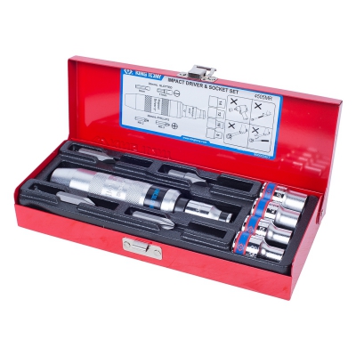Отвёртка ударная King Tony с принадлежностями (вставки, шестигранные головки, держатель) применяется для работы с проблемными крепёжными элементами. Механизм отвёртки, приводящийся в действие ударом по торцевой части рукоятки, проворачивает вставку на 1-2 мм, что позволяет сорвать прикипевший или ржавый крепёж. Инструмент используется при обслуживании автомобильных двигателей, станков, машин и прочего оборудования.