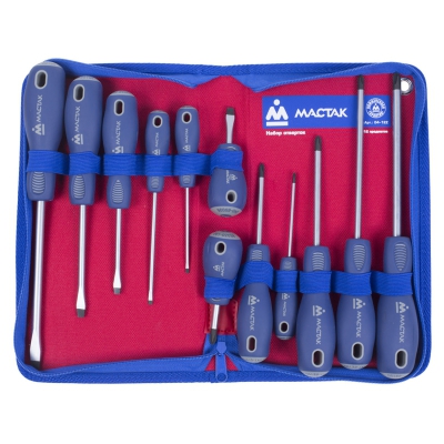 Набор отвёрток МАСТАК (12 предметов) состоит из инструментов наиболее применяемых размеров и профилей (крестовой, шлицевой), необходимых для работы с резьбовыми соединениями (саморезами, винтами, шурупами) при осуществлении механосборочных, слесарных, столярных и ремонтных работ. Комплект может эксплуатироваться на производстве, в быту, а так же в сфере профессионального автосервиса (СТО, автомастерские).