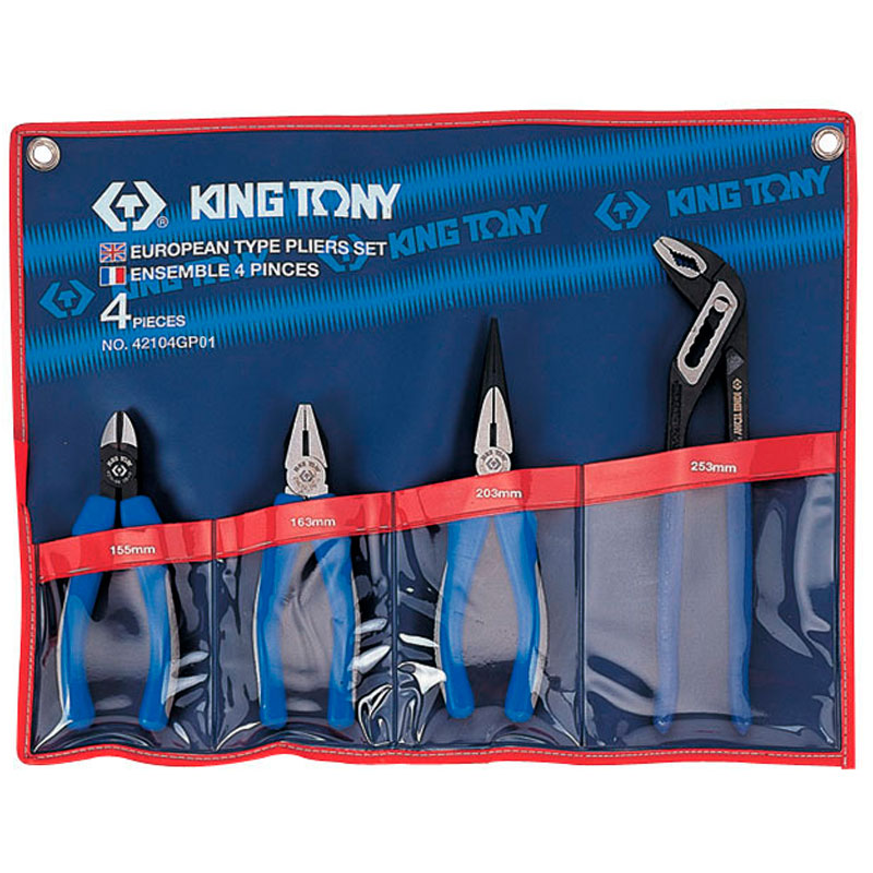 Набор известного бренда King Tony состоит из пассатижей, бокорезов, плоскогубцев и переставных клещей. Подходит для профессионального и бытового применения. Инструменты изготовлены из высокопрочной стали. Эргономичные рукоятки оснащены прорезиненными вставками. Прозрачный чехол с кармашками и указанной размерностью имеет специальные отверстия, позволяющие разместить комплект на рабочем месте.