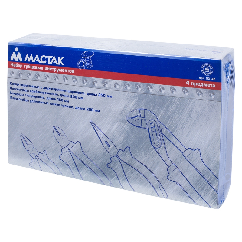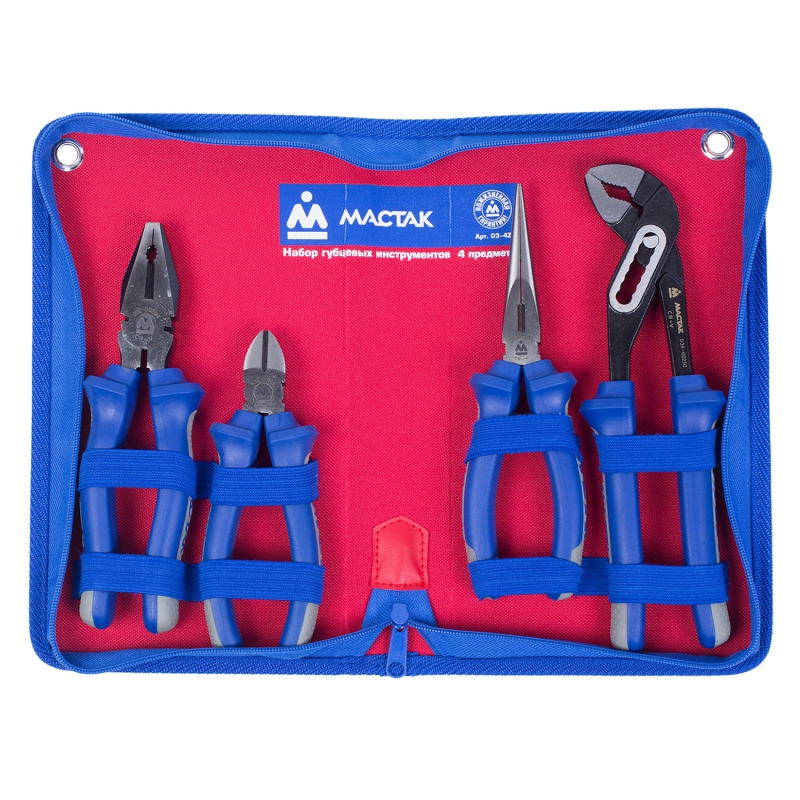 Набор Мастак используется в автосервисах и мастерских для снятия различных крепежных соединений. В комплект входят стандартные бокорезы, комбинированные пассатижи, тонконосые удлиненные плоскогубцы, переставные клещи с двухсторонним шарниром и футляр на молнии для хранения. Рабочая часть изготовлена из стали, устойчивой к повреждениям и износу. На рукоятках имеются прорезиненные вставки, предотвращающие выскальзывание инструментов из рук.