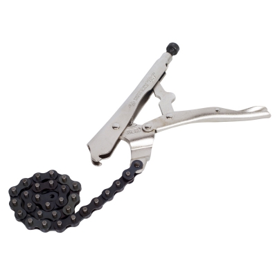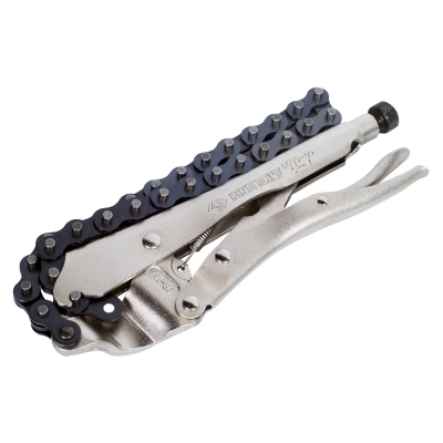 Зажим с фиксатором цепи для захвата и удержания труб при проведении сварочных работ. Размер металлических деталей - 60-140 мм. Обеспечивает крепкую фиксацию без скольжения. Изготовлен из прочной стали с повышенными физическими свойствами. Возможно применение при тяжелых профессиональных нагрузках.