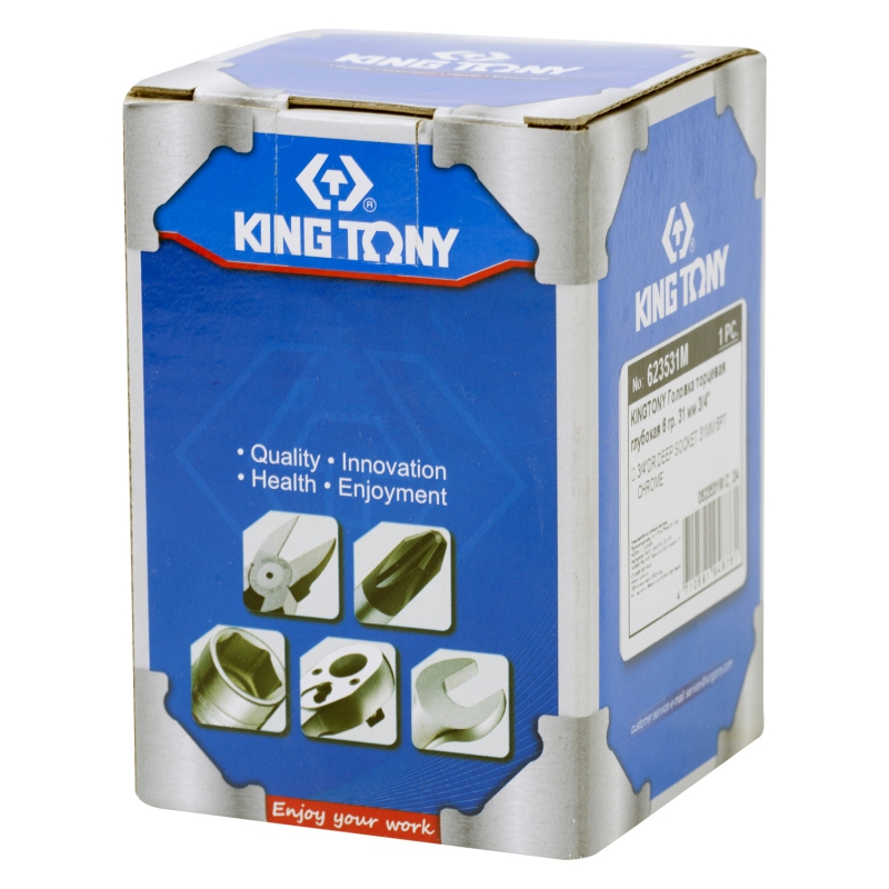 Глубокая торцевая головка King Tony выполнена из легированной стали высокой прочности, устойчивой к деформации и износу. Хромированное покрытие предотвращает появление коррозии. Обладает длительным сроком службы. Инструмент применяется для демонтажа удлиненных крепежных элементов. Основная область использования – станции ТО, автомастерские и сервисы. Изделие соответствует международным стандартам качества.