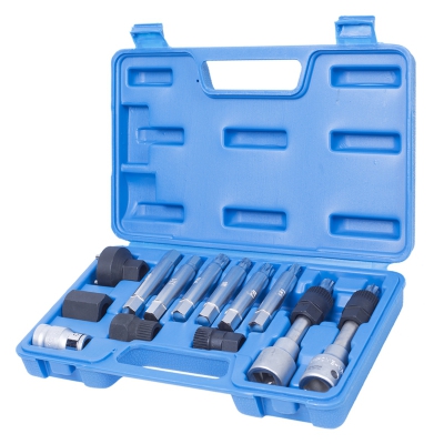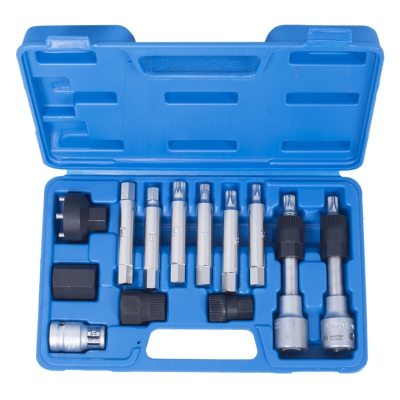 Специальные торцевые головки и насадки в пластиковом кейсе с защелками. Предназначены для удобства при установке или демонтаже шкивов генератора типа Bosch. Возможно применение с ручным инструментом для передачи крутящего момента. Набор подходит для ремонтных мастерских и СТО.