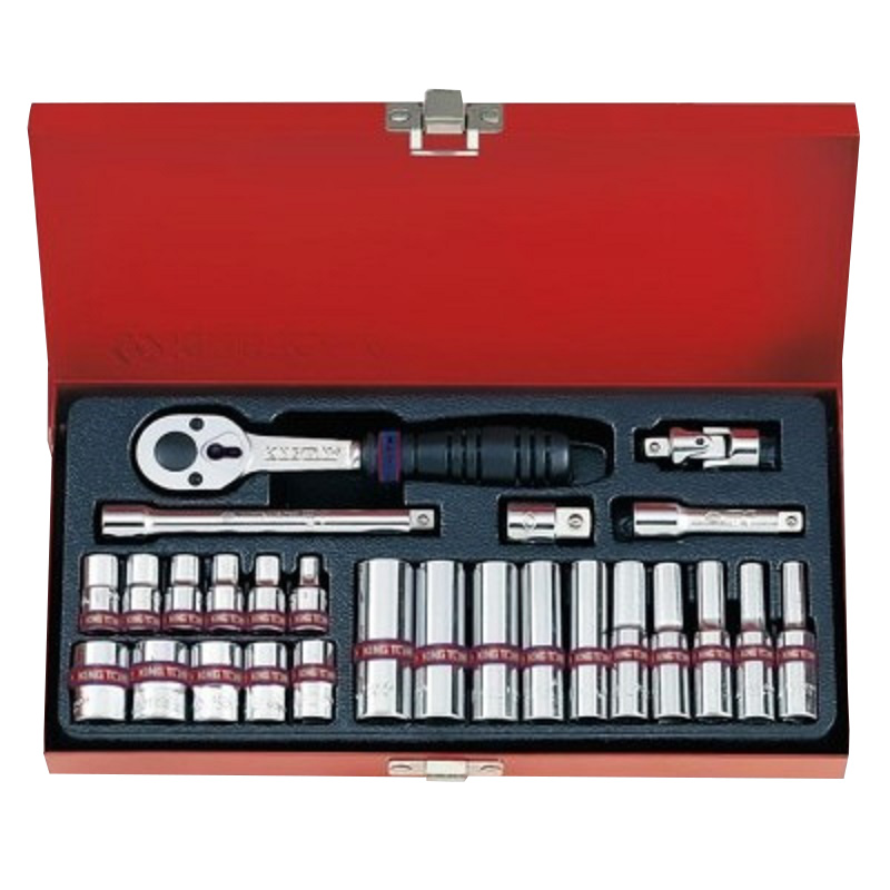 Комплект King Tony из 26 предметов находится в компактном кейсе с замком, который удобен для хранения инструментов. В наборе представлены шестигранные торцевые головки, глубокие и классические, удлинители, переходник, флажковая трещотка и кардан. Все элементы выполнены из прочных износостойких материалов.