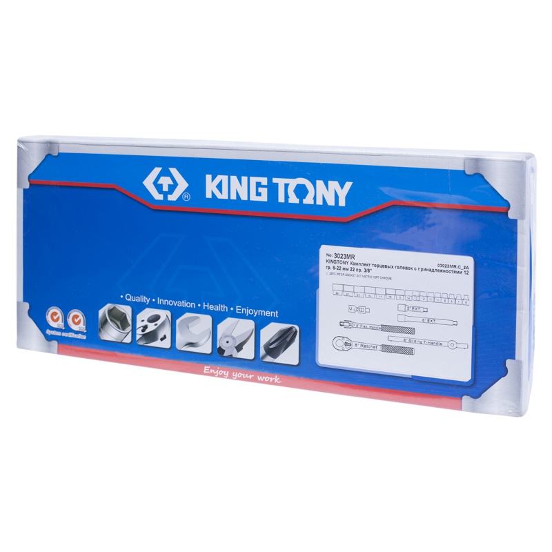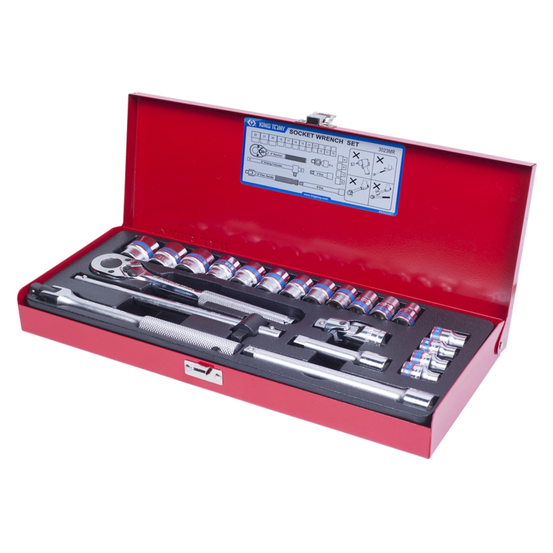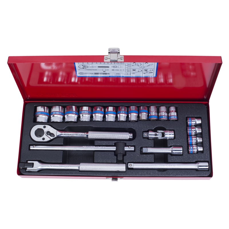 Функциональный комплект King Tony удобен для хранения и переноски, благодаря металлическому футляру с замком. В наборе – стандартные торцевые головки на 12 граней, 2 удлинителя, флажковая трещотка, кардан и воротки. Инструменты, изготовленные из прочного металла, надолго сохранят свои рабочие качества и внешний вид.