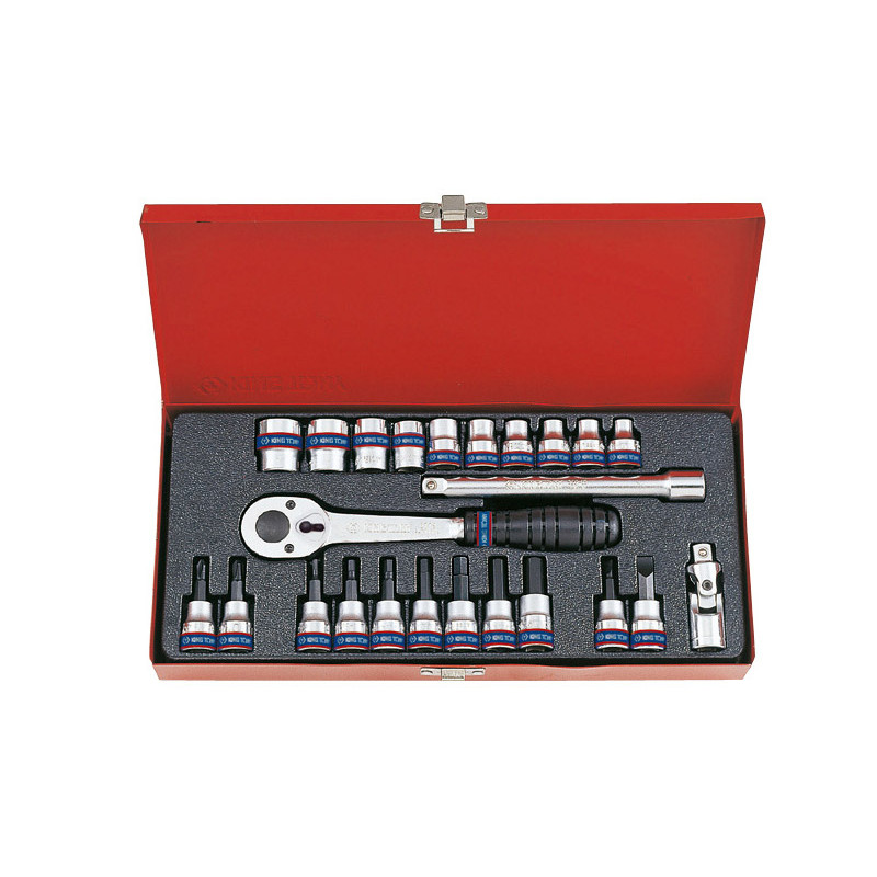 Комплект King Tony упакован в удобный кейс и состоит из 24 предметов. В наборе мастер найдет богатый выбор двенадцатигранных торцевых головок, а также удлинитель, кардан и флажковую трещотку. Все инструменты имеют популярный присоединительный квадрат в 3/8. Высокопрочный материал изготовления гарантирует долгий срок использования без повреждений.