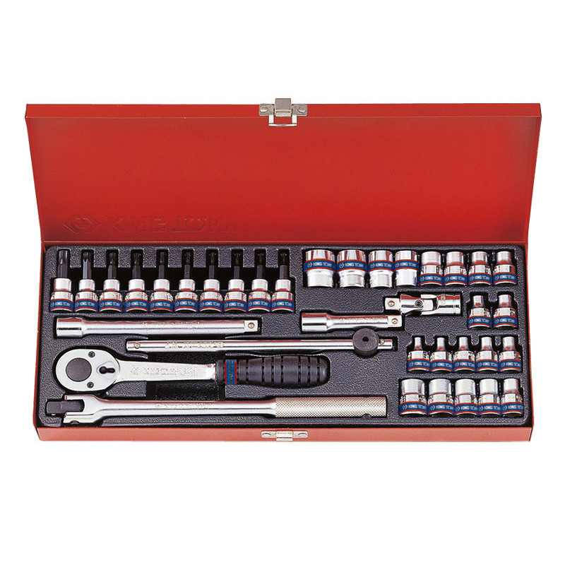 Большой набор King Tony упакован в удобный металлический кейс с замком. В набор входят торцевые головки на 12 граней разных размеров и типов, а также, удлинители, трещотка, кардан. Инструменты с присоединительным квадратом 3/8 сделаны из прочного металла и не подвержены коррозии.