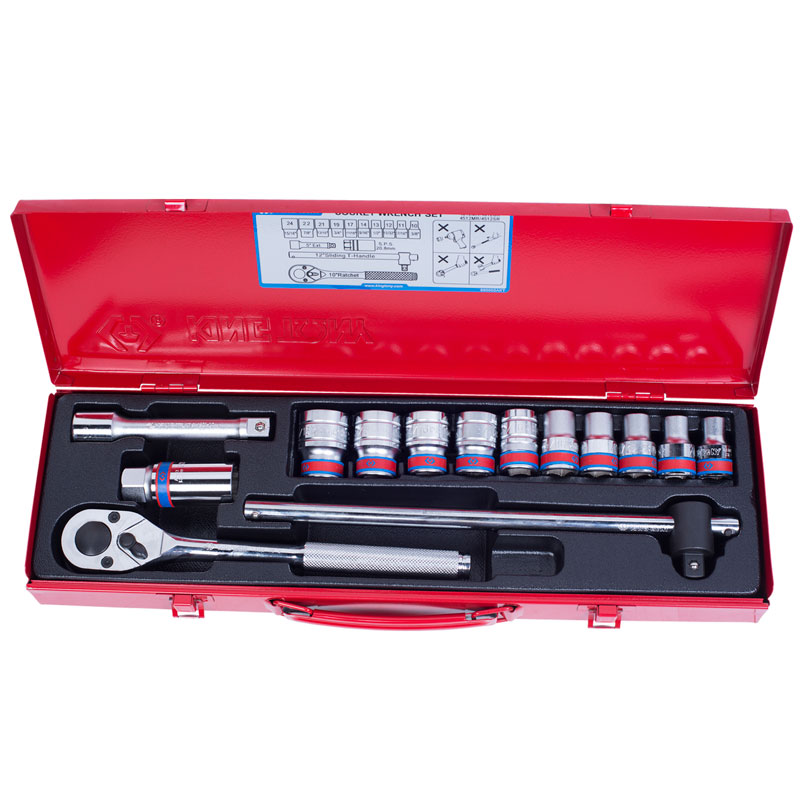 Набор торговой марки King Tony состоит из торцевых 12-гранных головок дюймовой размерности, удлинителя, скользящего воротка, трещотки с флажковым переключателем и свечной головки. Комплект используется при проведении различных ремонтных и демонтажных работ. Не заменим на станциях ТО и в автомастерских. Изделия изготовлены из прочной легированной стали, устойчивой к коррозии. Металлический кейс предназначен для удобного хранения инструмента.