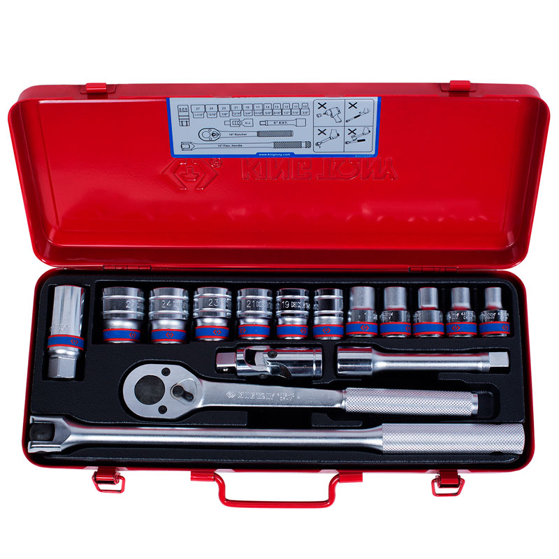 Набор торговой марки King Tony состоит из стандартных торцевых головок и принадлежностей: воротка с шарниром, кардана, удлинителя, трещотки с флажковым переключателем и свечной головки с резиновым фиксатором. Металлический кейс обеспечивает удобство при хранении и транспортировке инструментов. Изделия изготовлены из легированной стали высокой прочности с антикоррозионным хромированным покрытием.