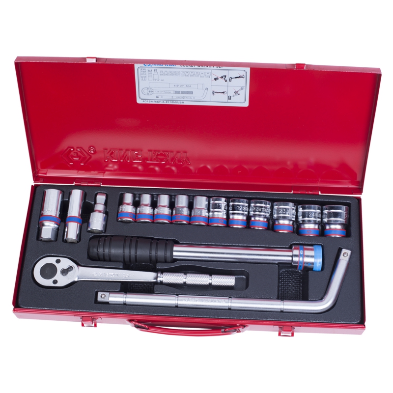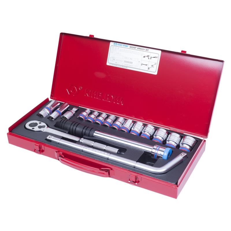 Набор торговой марки King Tony используется при проведении ремонтных и слесарных работ в автомастерской и на станции ТО. В комплект входят торцевые головки, удлиняемая трещотка с флажковым фиксатором, L-образный вороток, удлинитель, телескопический рычаг-труба, 6-ти и 12-гранная свечные головки. Изделия выполнены из легированной стали с антикоррозионным покрытием. Для хранения предусмотрен металлический футляр.