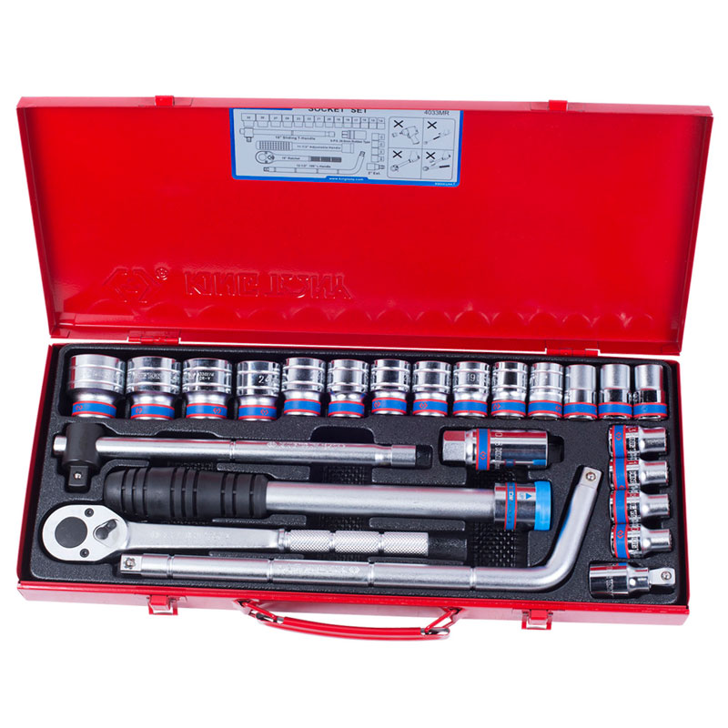 Набор торговой марки King Tony не заменим при проведении слесарных и ремонтных работ в автомастерской и на производстве. Инструменты выполнены из высококачественной легированной стали с антикоррозионным покрытием. В комплект входят торцевые 12-гранные головки, трещотка, два воротка (скользящий и L-образный), удлинитель, телескопический рычаг-труба., свечная головка и металлический футляр для хранения.