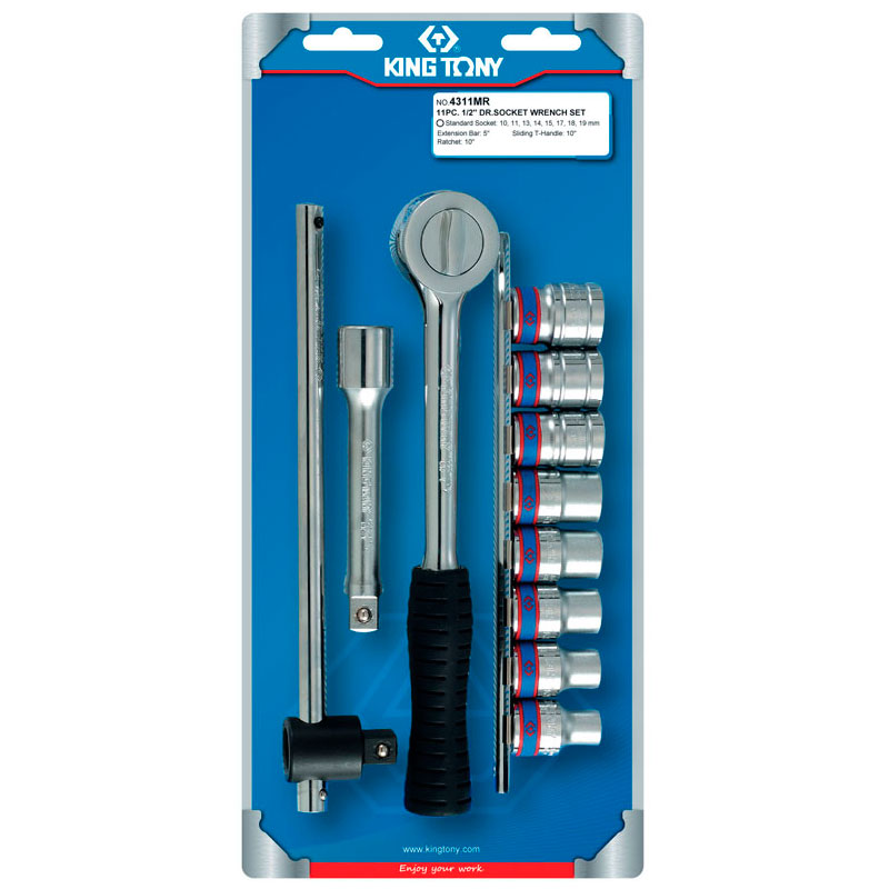 Набор известного бренда King Tony включает в себя восемь 6-гранных торцевых головок на подставке, скользящий вороток, удлинитель и трещотку с прорезиненной рукояткой и флажковым переключателем. Данный комплект применяется при ремонтных, слесарных и монтажных работах. Изделия выполнены из легированной закаленной стали, устойчивой к коррозии и механическим повреждениям. Характеризуются долговечностью и высоким качеством исполнения.