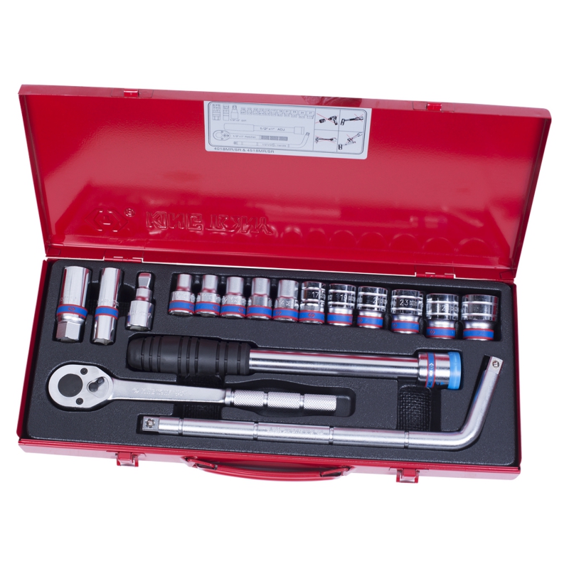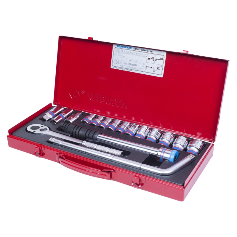 Набор известного бренда King Tony в автосервисах и на производстве при проведении ремонтных или слесарных работ с резьбовыми соединениями. Инструменты выполнен из закаленной стали, характеризующейся долговечностью и износостойкостью. Хромированное покрытие защищает от появления ржавчины. Комплект состоит из 6-гранных торцевых головок, трещотки с флажковым фиксатором, телескопического рычага-трубы, удлинителя, L-образного воротка, двух свечных головок и металлического футляра.