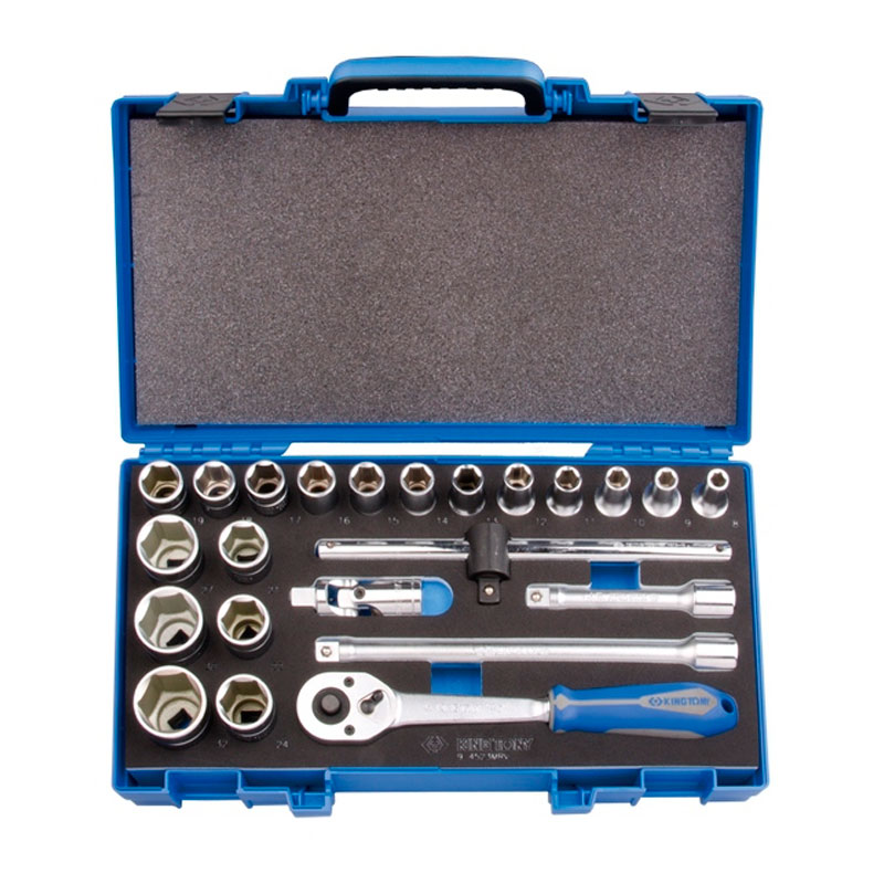 Набор известного бренда King Tony используется при проведении работ с различными крепежными соединениями. Широко применяется на производстве, станции техобслуживания и в автосервисе. Комплект состоит из торцевых шестигранных головок, двух удлинителей, кардана, скользящего воротка и трещотки флажкового типа. Пластиковый кейс выполнен из высокопрочного материала ЭВА, способного восстанавливать свою форму после деформации. Инструменты изготовлены из хромованадиевой стали, устойчивой к износу и коррозии.
