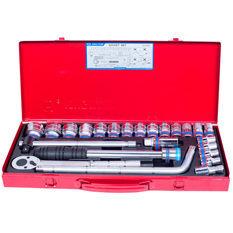 Набор известного бренда King Tony поставляется в прочном металлическом кейсе для удобства хранения и транспортировки. Инструменты изготовлены из высокопрочной хромованадиевой стали, устойчивой к коррозии, износу и деформации в условиях тяжелых нагрузок. Комплект состоит из шестигранных торцевых головок, трещотки с флажковым переключателем реверса, телескопического рычага-трубы, скользящего и L-образного воротков, удлинителя и свечной головки.