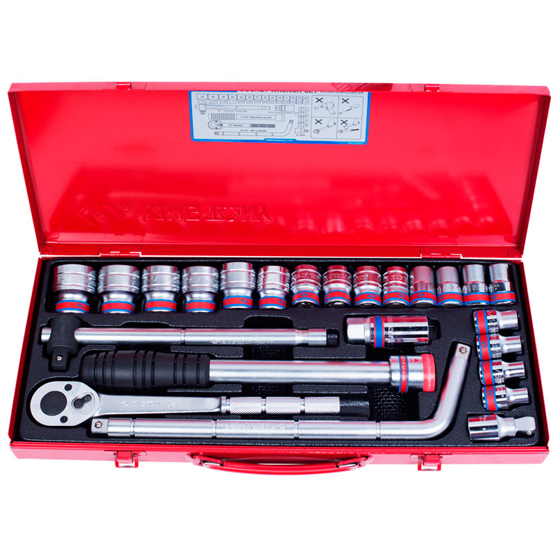 Набор известного бренда King Tony используется в автосервисах и на производстве при проведении слесарных, ремонтных и монтажных работ. Включает в себя шестигранные торцевые головки дюймовой размерности, удлинитель, флажковую трещотку, телескопический рычаг-трубу, скользящий и L-образный воротки, свечную головку. Инструменты выполнены из закаленной хромованадиевой стали с антикоррозионным покрытием. Для удобства хранения и транспортировки предусмотрен прочный металлический кейс.